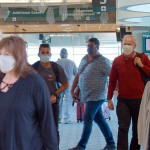 - TSA staff wearing masks at security checkpoint and cleaning gray bins after every use.