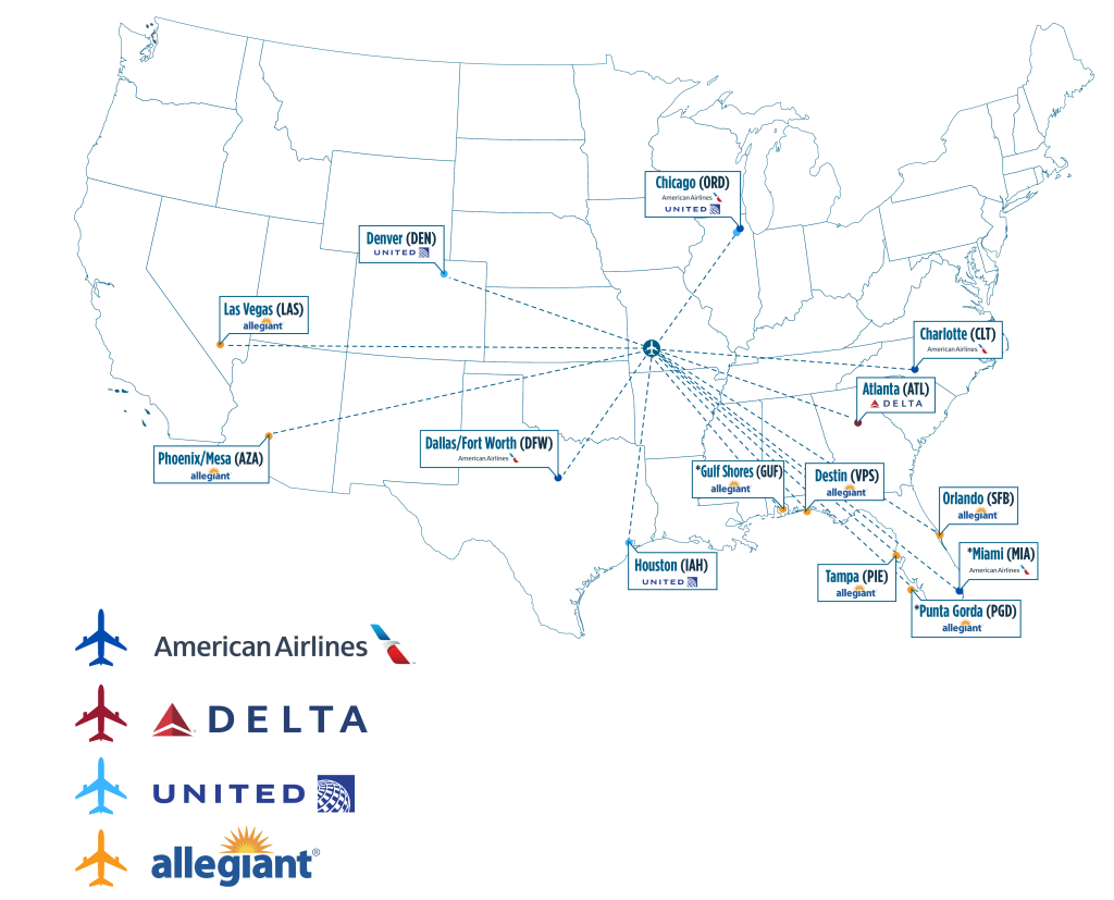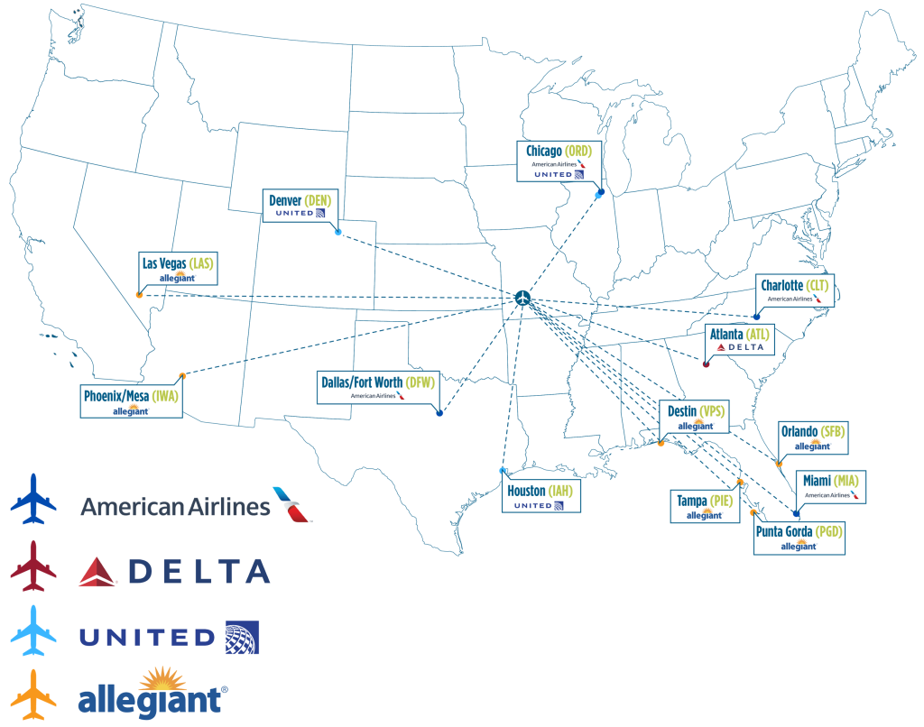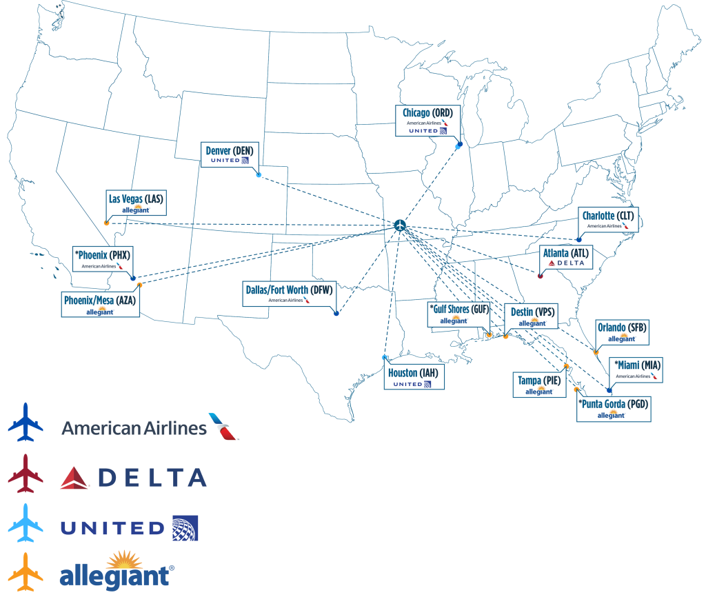 Click on an airline (below each city) to explore your flight options, which include many non-stop routes and frequent daily flights to five major connecting hubs.